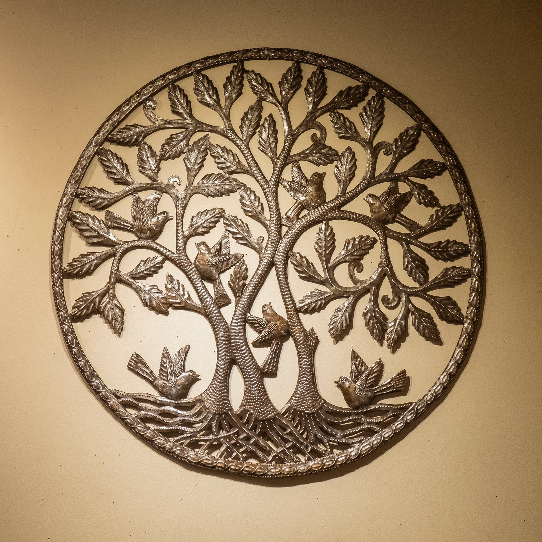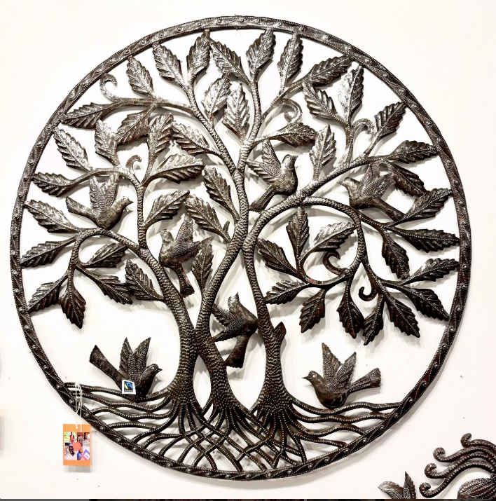Transform your space with our handcrafted Haitian Oildrum Art. Featuring a 34 inch diameter tree of life, each piece is meticulously made from upcycled oildrums in Haiti. Your purchase supports fair trade and adds a unique touch to your home decor.
