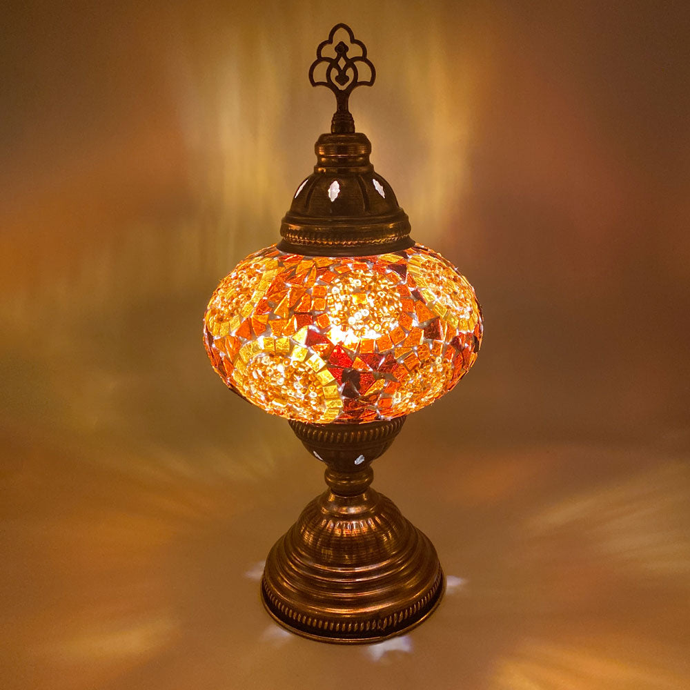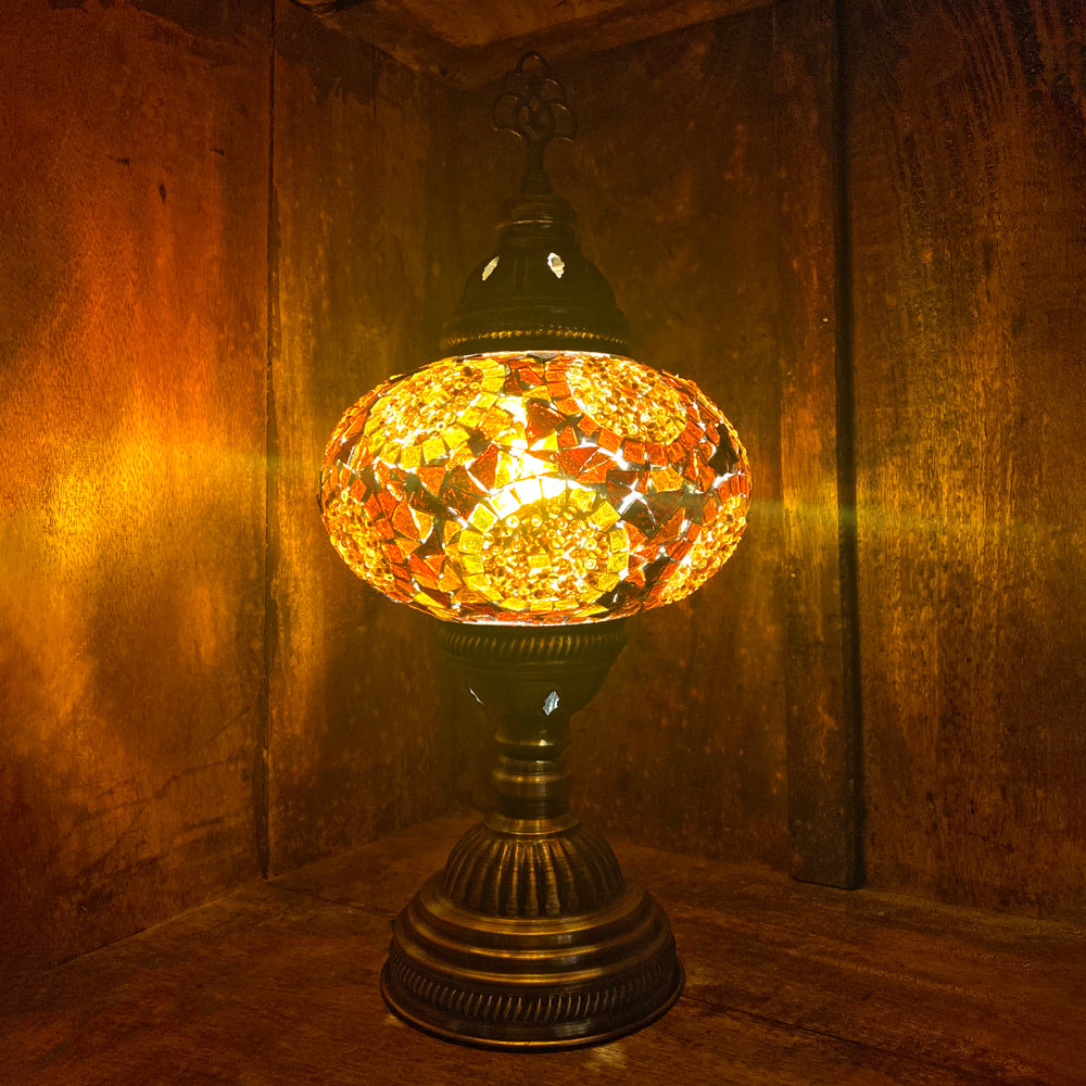 Our beautiful Turkish lamps are handmade using traditional techniques that can be traced back thousands of years. First, large sheets of colorful glass are cut into pieces that are mounted on a clear glass base. Applied with a clear adhesive, they are then grouted with a bonding paste and left to dry. When they are ready, each lamp is smoothed of sharp edges (the only mechanized part of the process) and attached to a brass or bronze base. Because each lamp is made by hand, no two are exactly the same.