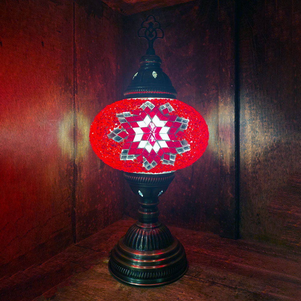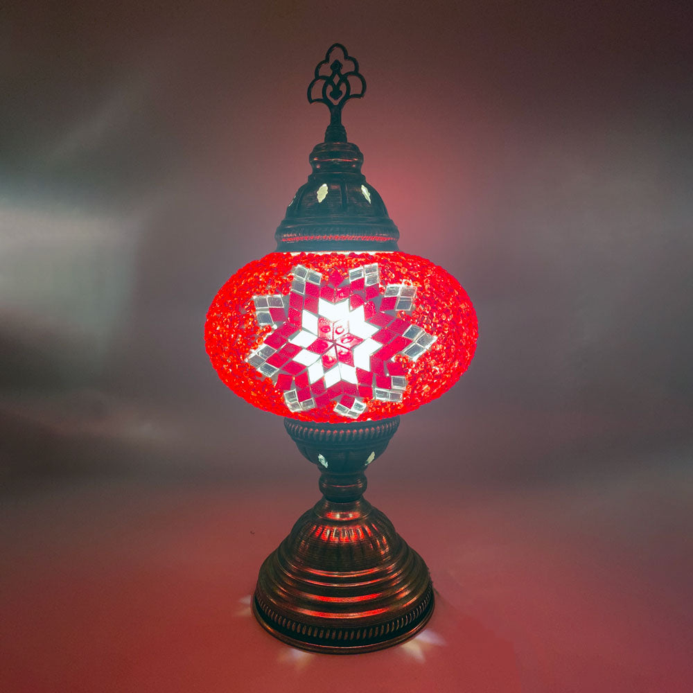 Our beautiful Turkish lamps are handmade using traditional techniques that can be traced back thousands of years. First, large sheets of colorful glass are cut into pieces that are mounted on a clear glass base. Applied with a clear adhesive, they are then grouted with a bonding paste and left to dry. When they are ready, each lamp is smoothed of sharp edges (the only mechanized part of the process) and attached to a brass or bronze base. Because each lamp is made by hand, no two are exactly the same.