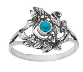 This sterling silver ring features a round turquoise stone set within an intricate floral and leaf design. All sales are final.