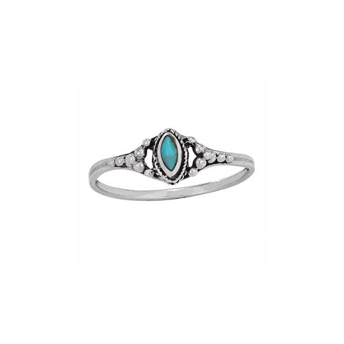 This delicate sterling silver ring features a marquise-cut turquoise set in a detailed, vintage-inspired band. The bright pop of blue contrasts beautifully with the oxidized silver beading, giving it an old-soul charm. Lightweight and easy to wear, it's perfect on its own or stacked with your favorites. All sales are final.