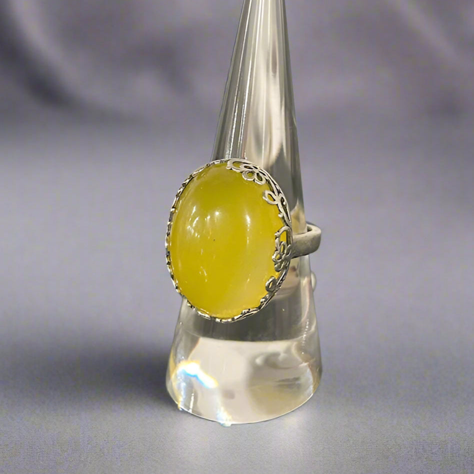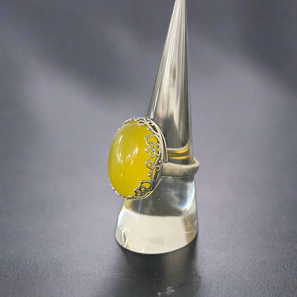 Set in sterling silver, this large yellow agate cabochon is framed by a delicate floral bezel. The smooth oval stone has a warm, translucent glow that catches the light from every angle.