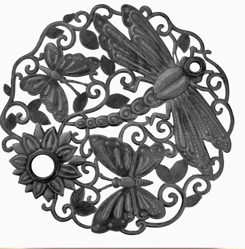 Transform your home with our Haitian Oildrum Butterfly Art. Made from recycled oil drums by local artisans in Haiti, each piece is unique, handmade and supports fair trade. Its lightweight, weather-resistant design makes it perfect for both indoor and outdoor use. Measuring at 23"x23", it's an eye-catching addition to any space.